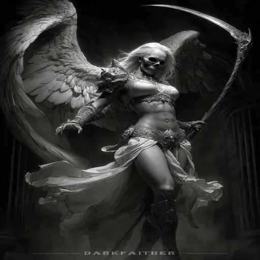 Uma mulher com asas de anjo e uma foice, parecendo uma morte, com o texto 'DARKFATHER' embaixo.