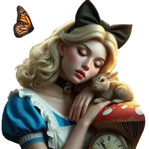 Uma mulher loira com um laço preto na cabeça e um vestido azul e branco aparece sonhando, com um coelho e um relógio de bolso em cima de um fungo. Uma borboleta laranja paira ao lado.