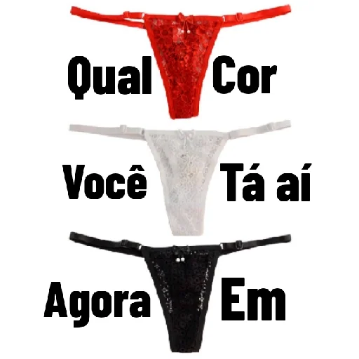 Três calcinhas de cores vermelha, branca e preta com texto 'Qual cor você tá aí agora em'