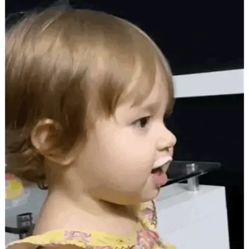 Menina loira com a boca aberta, parecendo surpresa ou chocada, usando uma roupa amarela com flores.