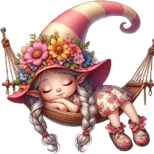 Uma menina fofa com longas tranças grisalhas e uma grande cartola rosa decorada com flores coloridas está dormindo em uma rede. Ela usa um vestido curto com flores e sapatinhos decorados.
