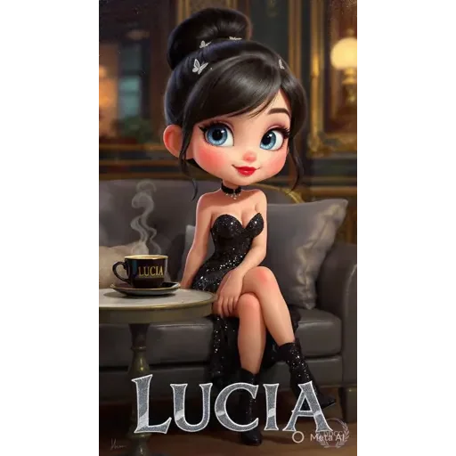 Uma mulher de cabelo preto e olhos azuis sentada em um sofá com um bule de café fumegante em uma mesa ao lado. Ela está vestida com um vestido preto e tem o nome 'LUCIA' escrito abaixo.