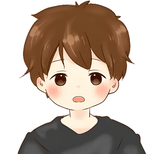 Menino de anime com cabelo castanho e olhos castanhos, corado e com a boca ligeiramente aberta, vestindo uma camiseta preta.