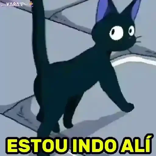 Um gato preto de olhos grandes e orelhas roxas, com a frase 'ESTOU INDO ALÍ' em amarelo com contorno preto.