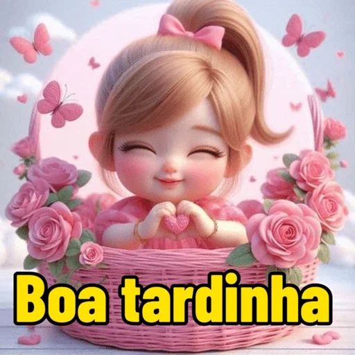 Menina fofa com cabelo castanho e laço rosa, sentada em uma cesta de flores rosas, com as mãos unidas e olhos fechados. Há borboletas e flores ao redor. A imagem traz o texto 'Boa tardinha'.