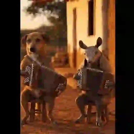 Dois animais, um com aparência de cachorro e outro de cavalo, sentados em cadeiras e tocando instrumentos musicais.