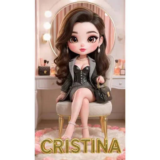 Uma menina de estilo cartoon sentada em uma cadeira de frente a um espelho, vestindo um conjunto cinza e preto, com o nome 'CRISTINA' em letras douradas abaixo dela.