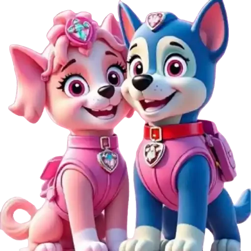 Dois cachorros fofos, um rosa e um azul, com coletes cor-de-rosa e medalhões em forma de coração, sorrindo.