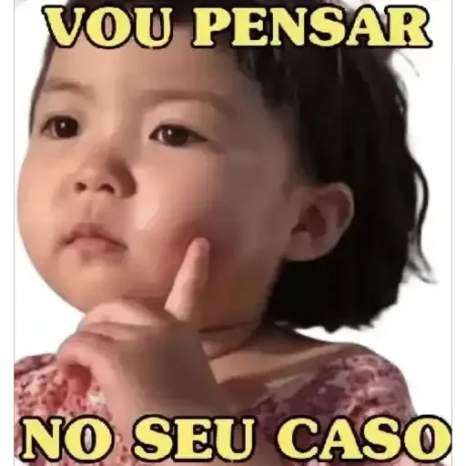 Menina com expressão pensativa, mão no queixo e olhar para cima, com texto "VOU PENSAR NO SEU CASO" em amarelo.