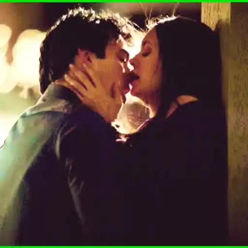 Cena de um casal se beijando, com o homem de mãos dadas no rosto da mulher, em um ambiente escuro com luzes ao fundo.