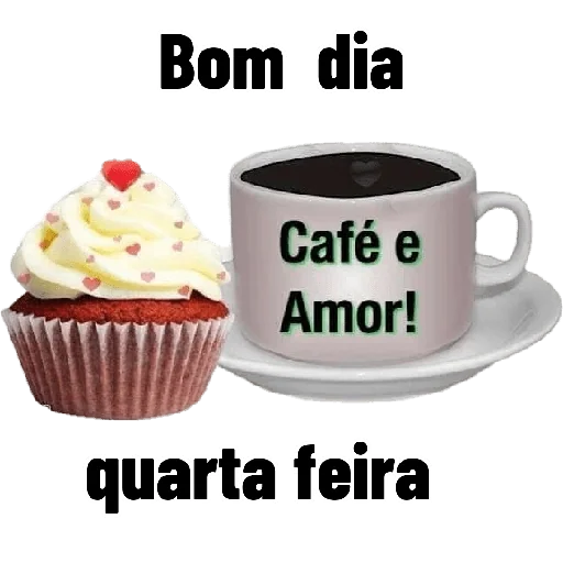 Um desenho de uma xícara de café com o texto 'Café e Amor!' ao lado de um cupcake com cobertura branca e um coração vermelho em cima, com os textos 'Bom dia' e 'quarta feira' acima e abaixo.