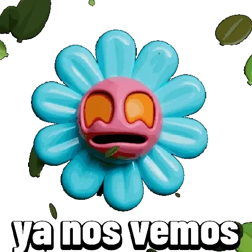Uma flor azul com um rosto rosa triste e olhos laranja, com a expressão de desânimo. Abaixo da flor, está escrito 'ya nos vemos'.