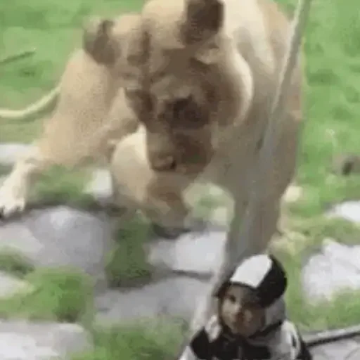 Um leão feroz olha para baixo enquanto uma pessoa com capacete de segurança está em frente a ele, em um cenário com grama e pedras.