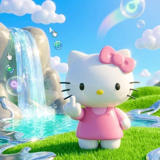 Hello Kitty vestida de rosa, fazendo um gesto com a mão direita, em um cenário com cachoeira, bolhas e nuvens fofas.