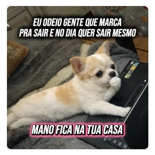 Um cachorro Chihuahua branco com manchas marrons deitado em uma cama cinza, com um laptop ao lado, e texto em português "EU ODEIO GENTE QUE MARCA PRA SAIR E NO DIA QUER SAIR MESMO" e "MANO FICA NA TUA CASA" destacado em rosa.