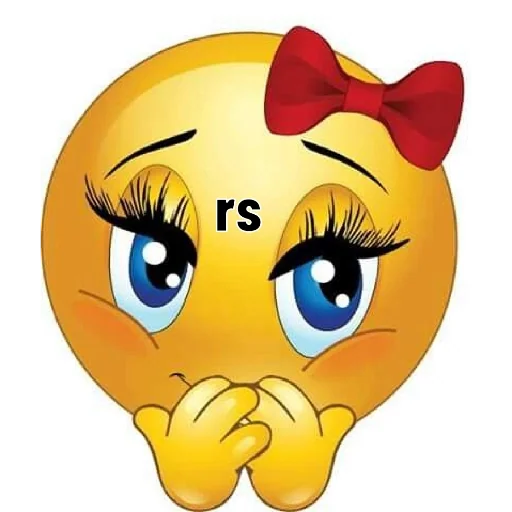 Emoji amarelo com uma fita vermelha no cabelo, olhos azuis com cílios longos, sobrancelhas arqueadas e mãos na frente da boca. Contém o texto 'rs'.