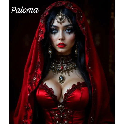 Mulher com longos cabelos pretos e olhos escuros, vestindo um traje vermelho com véu, joias e uma peça de adorno na testa. O nome 'Paloma' aparece no canto superior esquerdo.