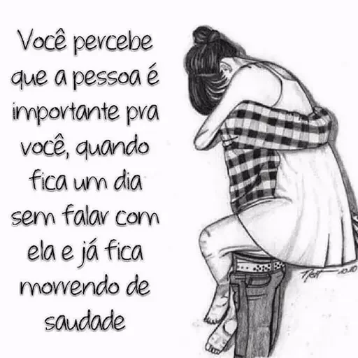 Uma mulher sentada em um banco, abraçando um xale xadrez, com uma expressão de saudade. O texto ao lado diz: 'Você percebe que a pessoa é importante pra você, quando fica um dia sem falar com ela e já fica morrendo de saudade'.