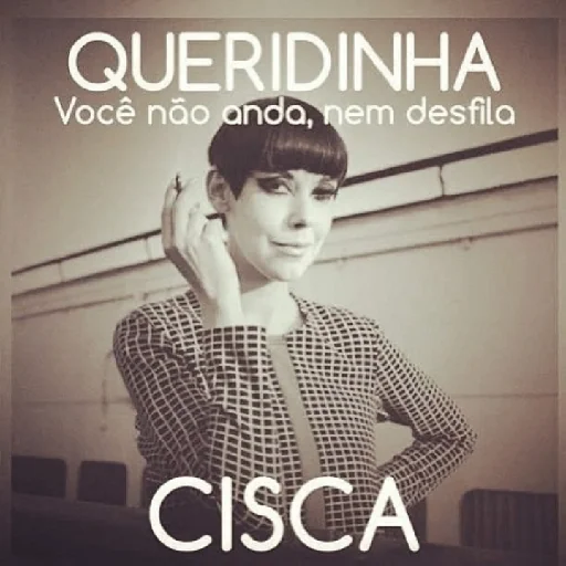 Uma mulher com franja e um vestido xadrez posando com a mão no rosto, com o texto 'QUERIDINHA Você não anda, nem desfila CISCA' sobreposto.