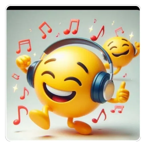 Um emoji amarelo dançando com fones de ouvido e notas musicais vermelhas ao redor, com outro emoji sorridente ao fundo.