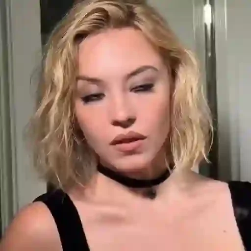 Rosto de uma mulher loira com expressão séria e choker preto, olhar dirigido para baixo.