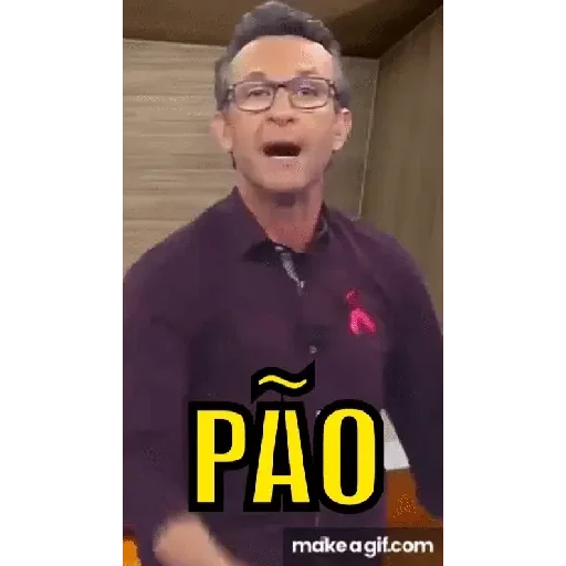 Um homem com óculos e cabelo curto, vestindo uma camisa roxa, com a boca aberta e o texto 'PÃO' em amarelo na frente dele.