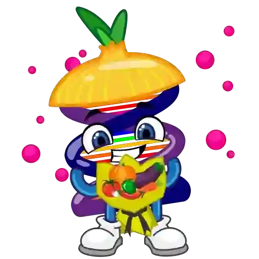 Um personagem de desenho animado, um cogumelo colorido com pernas e braços, acenando com a mão. O cogumelo tem uma…
