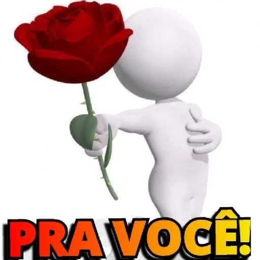 Um boneco branco segurando uma rosa vermelha com a frase 'PRA VOCÊ!' em letras coloridas.