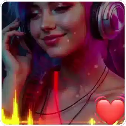 Uma jovem com fones de ouvido e um coração vermelho ao fundo, com efeito de chamas. Ela parece estar ouvindo música com um sorriso leve no rosto.
