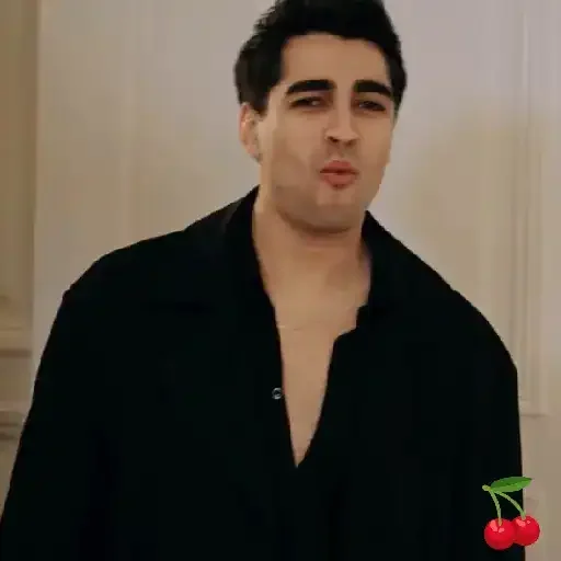 Homem de cabelo preto e camisa preta com cerejas vermelhas no canto inferior direito.