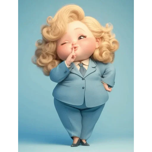 Uma mulher de cabelo loiro encaracolado e terno azul fazendo um gesto de silêncio com o dedo indicador na boca.
