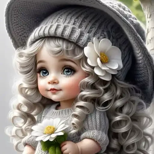 Menina com cabelo grisalho encaracolado, olhos azuis e chapéu cinza, segurando flores brancas.