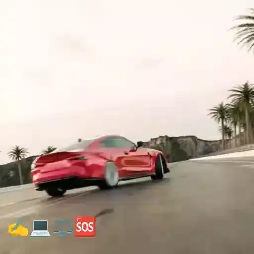 Um carro vermelho em alta velocidade em uma estrada com palmeiras ao fundo. Há um logotipo com as letras SOS no canto inferior direito.