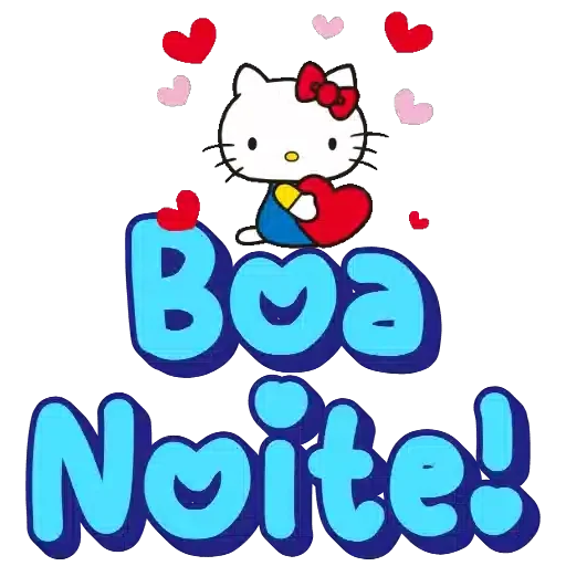 Hello Kitty com um laço vermelho no cabelo, segurando um coração vermelho, rodeada de corações coloridos e com a frase 'Boa Noite!' em letras azuis.
