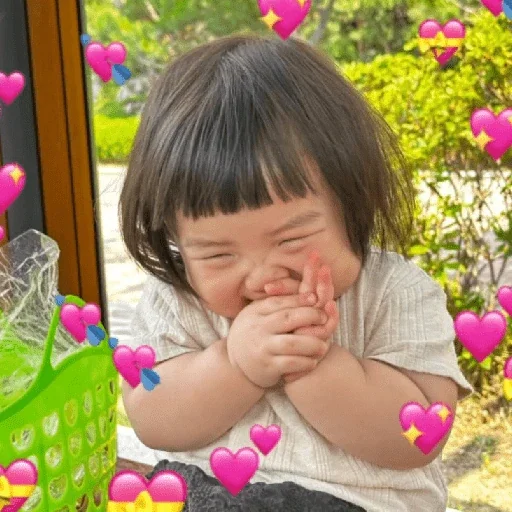 Menina com franja e olhos fechados, mãos no rosto, cercada de corações rosa. Ela parece envergonhada ou feliz.