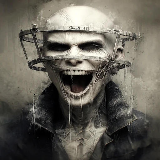 Rosto de um homem careca com a boca aberta e olhos escuros, usando uma espécie de gaiola ou grade sobre o rosto. A imagem tem tons cinzas e escuros.