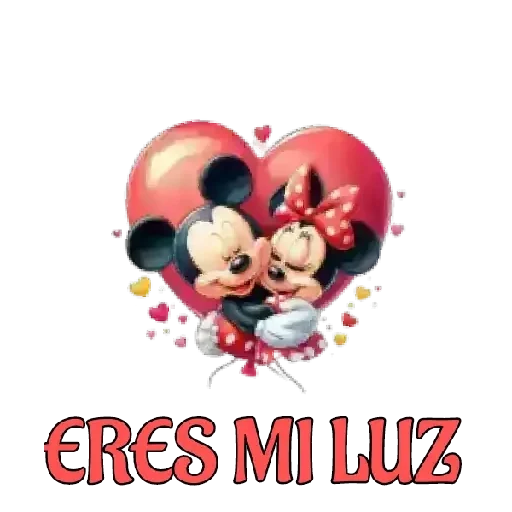 Mickey e Minnie Mouse se beijando dentro de um coração vermelho gigante, com balões e corações ao redor. Abaixo deles, está escrito 'ERES MI LUZ'.