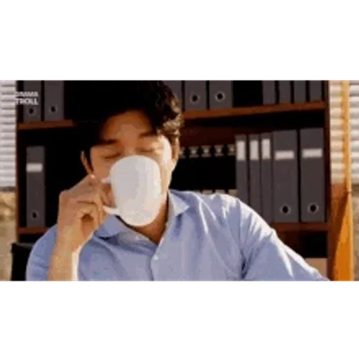 Homem de camisa azul bebendo de uma xícara branca em frente a uma estante de arquivos.