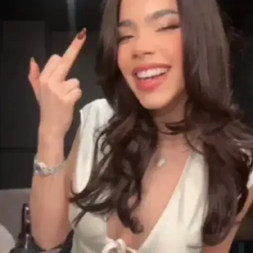 Uma jovem mulher com cabelo castanho e um sorriso malicioso fazendo um gesto obsceno com a mão.