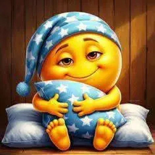 Um emoji amarelo sorridente usando uma touca de dormir azul com estrelas brancas, sentado em uma almofada e abraçando outra almofada com estrelas.
