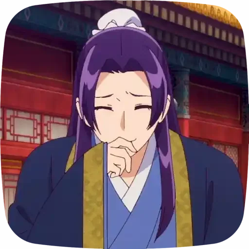 Personagem de anime com cabelo roxo e kimono azul, pensativo com a mão no queixo.