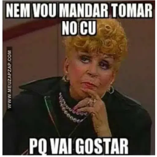 Uma mulher loira com expressão pensativa e mão no queixo, com texto em branco: 'NEM VOU MANDAR TOMAR NO CU PQ VAI GOSTAR'.