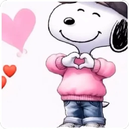 Snoopy de olhos fechados e sorriso no rosto, fazendo um coração com as mãos. Ele veste uma blusa rosa e calça jeans. Há um coração rosa grande ao lado esquerdo.