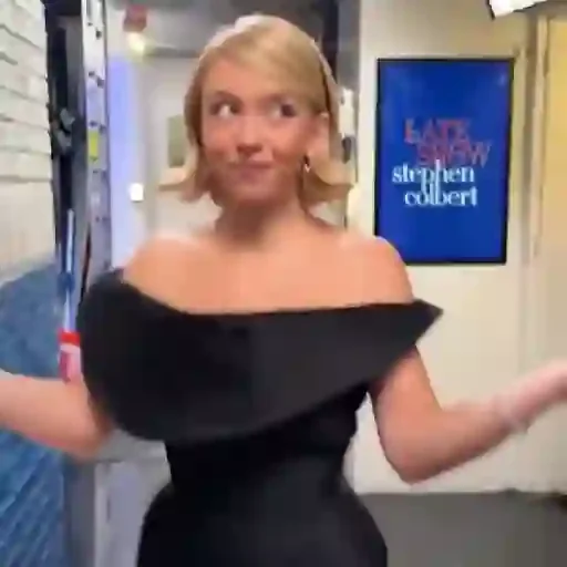 Mulher loira com vestido preto fazendo um gesto com os braços, parecendo surpresa ou confusa, em um cenário que parece um estúdio de TV com um cartaz ao fundo.