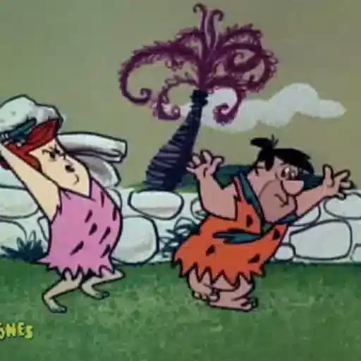 Um casal de personagens pré-históricos, um homem e uma mulher, estão em frente a uma palmeira. O homem veste uma roupa laranja e a mulher uma roupa rosa, ambos com expressões engraçadas.