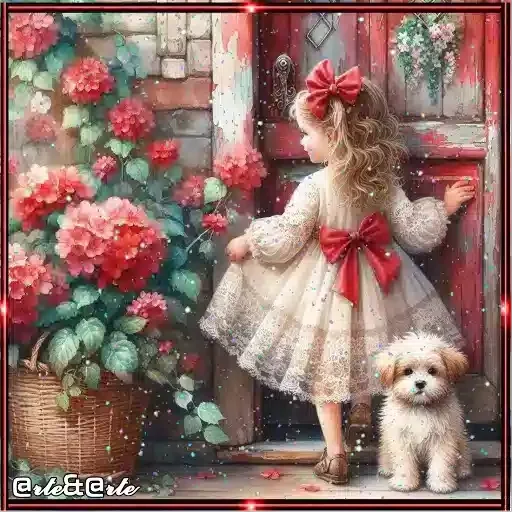 Menina de vestido branco com laço vermelho e um cachorro branco ao lado, diante de uma porta vermelha com flores rosa.