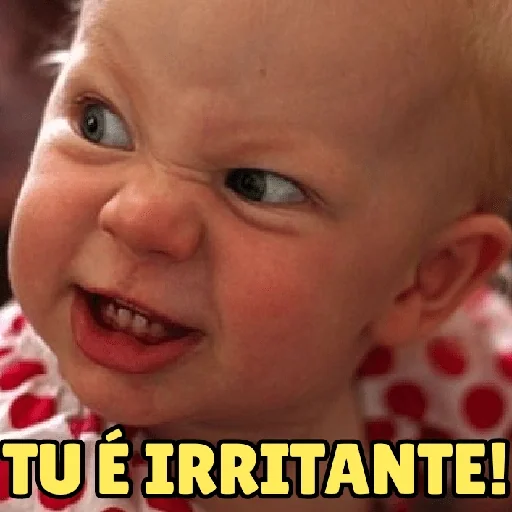 Um bebê com expressão facial de irritação, franzindo a testa e com a boca aberta. A legenda 'TU É IRRITANTE!' aparece em amarelo na parte inferior.