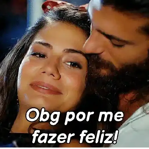 Um casal, com o homem encostando o rosto no lado da cabeça da mulher, que olha para frente com expressão feliz. O texto 'Obg por me fazer feliz!' aparece na parte inferior.