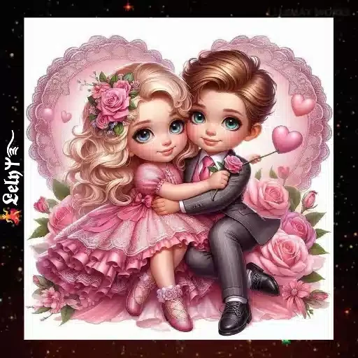 Um casal de crianças abraçados, com o menino segurando uma rosa e um coração. A menina está vestida com um vestido rosa e uma flor na cabeça, enquanto o menino usa um terno cinza e gravata rosa.