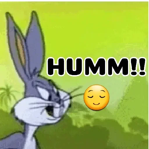 Bugs Bunny com expressão pensativa e um emoji de sorriso ao lado, com o texto 'HUMM!!'